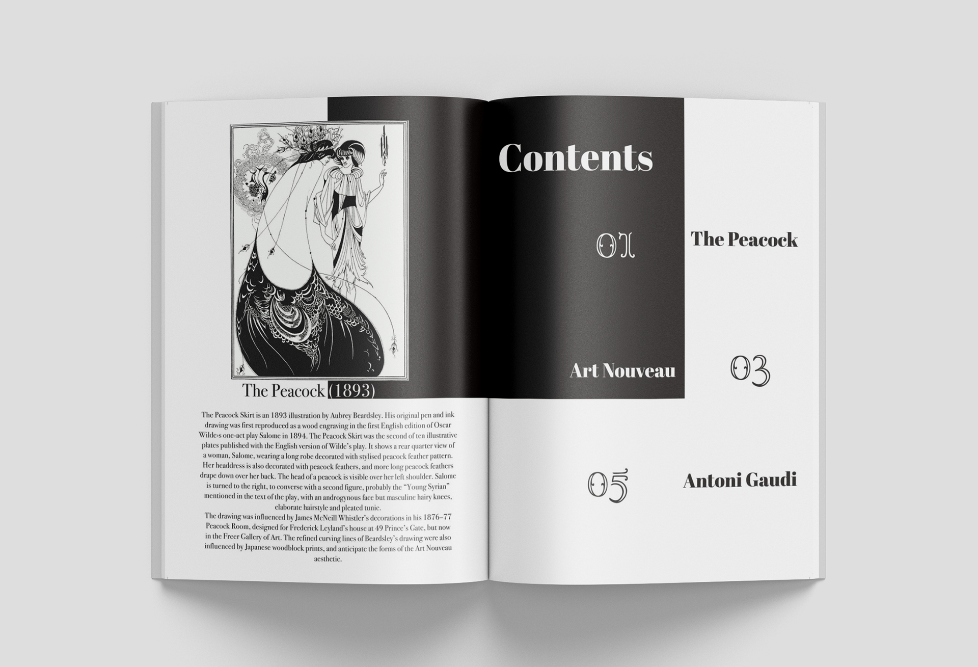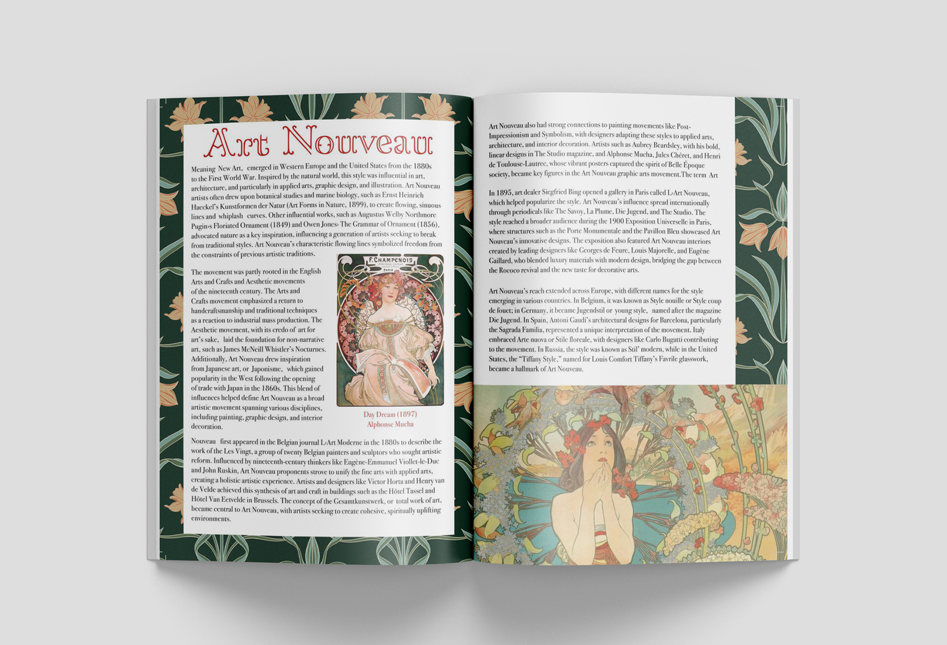 For this project I created a magazine called Pigments that focuses on the Art Nouveau movement. I used InDesign to build the layouts and pulled in classic Art Nouveau elements like flowing lines, organic shapes, and decorative motifs to tie everything together. The goal was to make the magazine feel modern while still showing the beauty and influence of the movement. Each spread mixes clear information with expressive visuals to highlight how Art Nouveau shaped art and design.